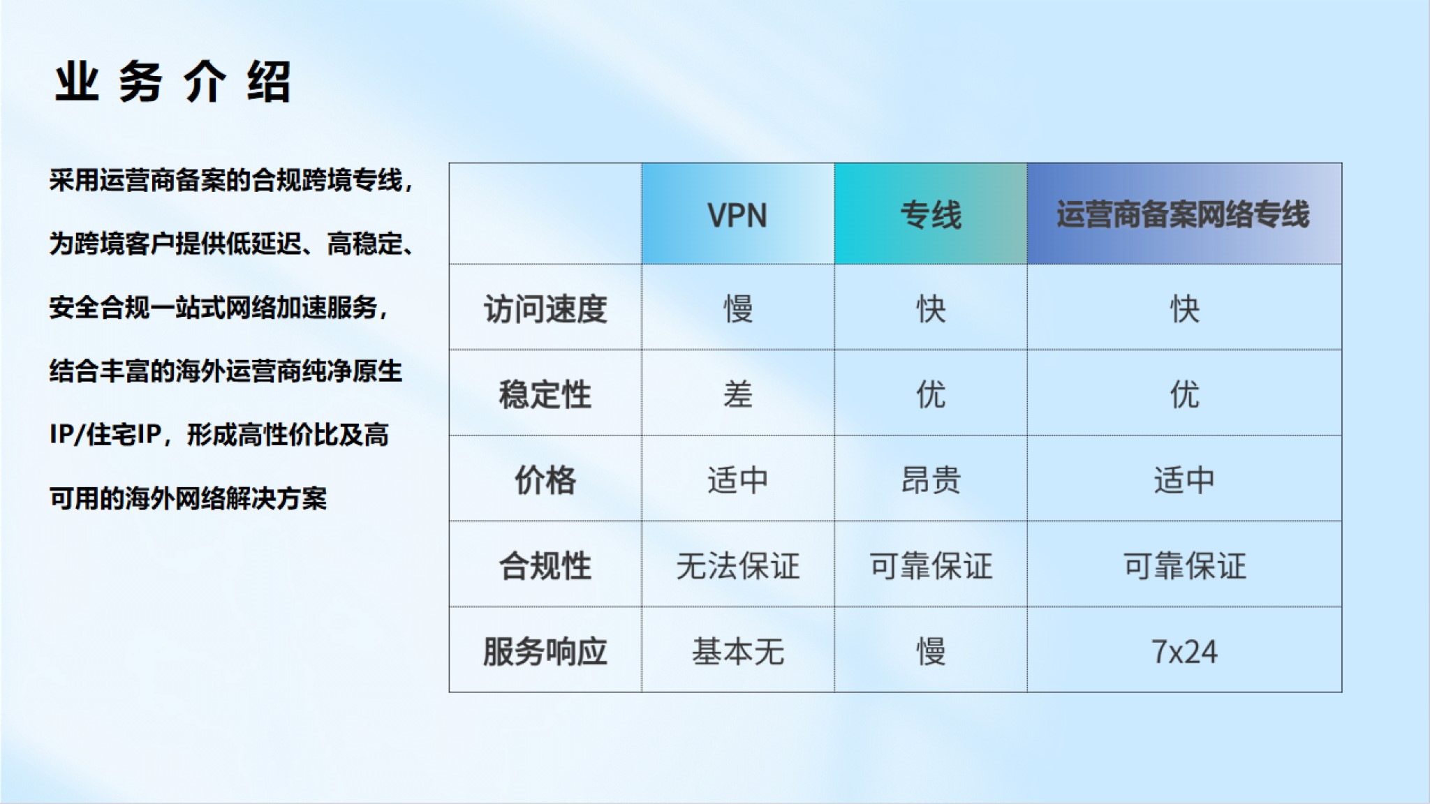 遵從運營商規(guī)則,采用運營商備案網(wǎng)絡專線,結合海外運營商純凈獨享原生IP,提供低延遲、高穩(wěn)定、安全合規(guī)的海外網(wǎng)絡服務